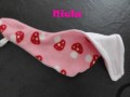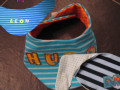 Mit schmalem Klettverschluss, damit es nicht kratzt, auf Wunsch auch mit Druckknopf.